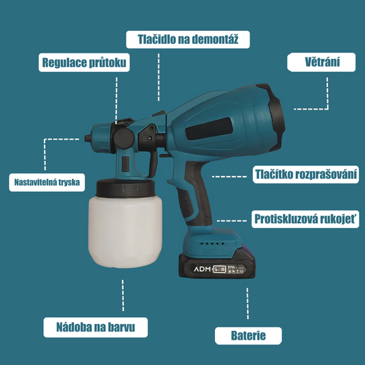 Profesionální stříkací pistole na barvu s baterií a nastavitelným postřikem